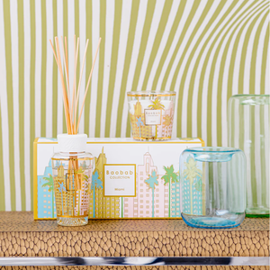La vela perfumada y el difusor de fragancia Miami están decorados con una serigrafía en tonos pastel y dorados retomando la arquitectura de los edificios Art Deco de South Beach.